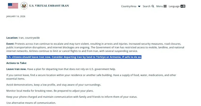 ABD, İran’da devam eden protestolar nedeniyle güvenlik risklerinin arttığını belirterek, vatandaşlarına ülkeyi terk etmeleri uyarısında bulundu.