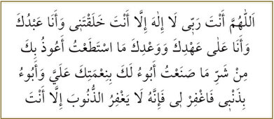 “Allahümme ente Rabbî lâ ilahe illâ ente halaktenî ve ene abdüke ve ene alâ ahdike ve vâ’dike mes’tetâtü eûzü bike min şerri mâ sanâtü ebû’ü leke bi-nîmetike aleyye ve ebû’ü bizenbî fağfirlî feinnehû lâ yağfıruz-zünûbe illâ ente”*