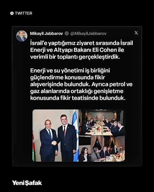 Azerbaycan Ekonomi Bakanı Mikayil Jabbarov, İsrail Enerji ve Altyapı Bakanı Eli Cohen ile görüşmek üzere işgal altındaki topraklara bir ziyaret gerçekleştirdi. Bakanlar arasında yapılan temaslar, iki ülke arasındaki stratejik iş birliğinin derinleştirilmesi açısından yeni bir adım olarak değerlendirildi.