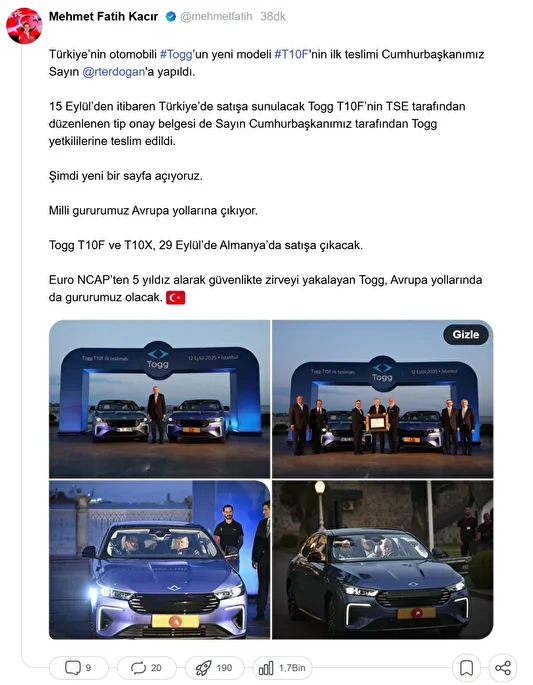 “15 Eylül’den itibaren Türkiye’de satışa sunulacak Togg T10F’nin TSE tarafından düzenlenen tip onay belgesi de Sayın Cumhurbaşkanımız tarafından Togg yetkililerine teslim edildi. Şimdi yeni bir sayfa açıyoruz. Milli gururumuz Avrupa yollarına çıkıyor. Togg T10F ve T10X, 29 Eylül’de Almanya’da satışa çıkacak. Euro NCAP’ten 5 yıldız alarak güvenlikte zirveyi yakalayan Togg, Avrupa yollarında da gururumuz olacak.”