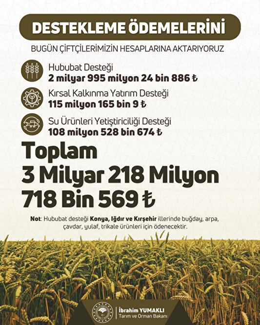 Paylaşımda yer alan bilgiye göre söz konusu destek tutarları, hububat için 2 milyar 995 milyon 24 bin 886, kırsal kalkınma yatırımları için 115 milyon 165 bin 9, su ürünleri yetiştiriciliği için de 108 milyon 528 bin 674 lira olarak belirlendi.