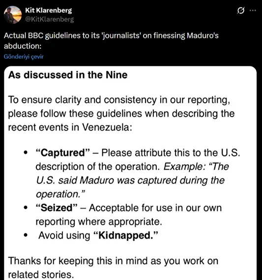 “BBC’nin Maduro’nun kaçırılması olayını ustaca ele almak için ‘gazetecilerine’ verdiği gerçek yönergeler” başlıklı paylaşım.