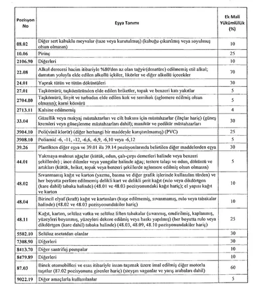 2018 yılındaki karara göre; ek vergi uygulanan başlıca ürünler şöyleydi: