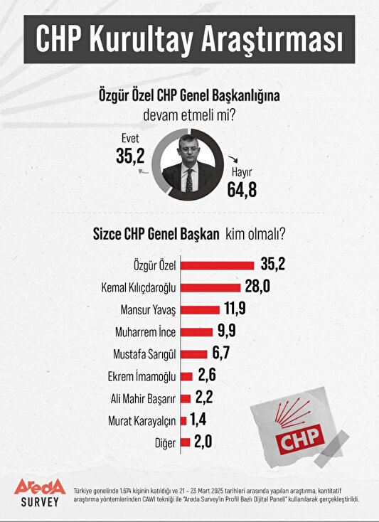 Areda Survey’in 21 – 23 Mart 2025 tarihleri arasında gerçekleştirdiği araştırma, CHP Genel Başkanı Özgür Özel’in liderliğiyle ilgili kamuoyunun nabzını tuttu. Araştırmaya göre, katılımcıların yüzde 64,8’i Özel’in genel başkanlık görevine devam etmemesi gerektiğini düşünüyor. Parti içindeki genel başkanlık tartışmalarına yönelik yöneltilen “CHP Genel Başkanı kim olmalı?” sorusuna verilen yanıtlar ise farklı isimleri öne çıkarıyor. Katılımcıların yüzde 35,2’si Özgür Özel’i desteklerken, yüzde 28’i CHP’nin önceki Genel Başkanı Kemal Kılıçdaroğlu’nu destekliyor.