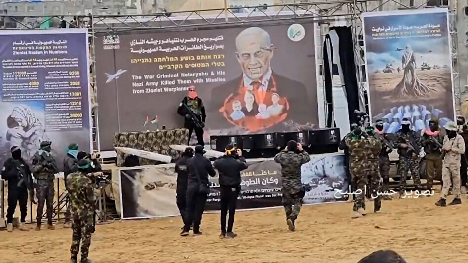 yazılı dev bir afiş asıldı. Gazze Şeridi’nin güneyindeki Han Yunus’ta “Oded Lifshitz” isimli İsrailli ile “Bibas” ailesine mensup 3 kişiye ait naaşları Kızılhaç ekiplerine teslim etti. Törende Kassam Tugayları bölgede geniş güvenlik önlemleri aldı.