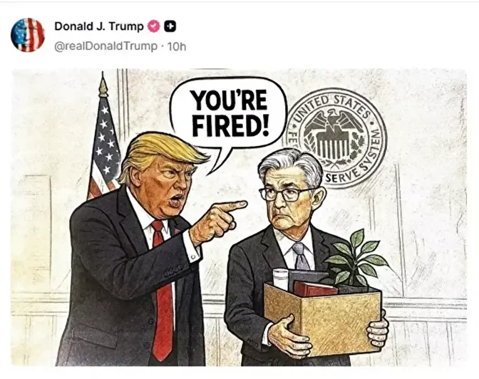 Trump’ın paylaştığı çizimde, kendisiyle Powell yan yana tasvir edilirken, “Kovuldun” ifadesi öne çıktı. Karikatür, Trump’ın Fed Başkanı’na yönelik sert eleştirilerinin yeni bir yansıması olarak değerlendirildi.