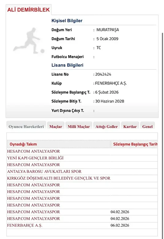 Ara transfer döneminin kapanmasına saatler kala Fenerbahçe Kulübü, Antalyaspor’dan genç futbolcu Ali Demirbilek’i kadrosuna kattı. Sarı-lacivertliler genç ismin lisansını TFF’ye bildirdi.