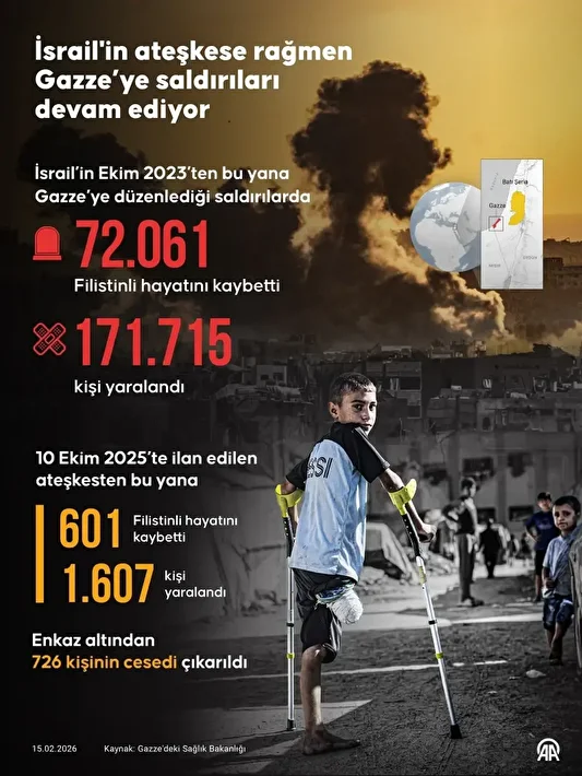Gazze’de ateşkesin yürürlüğe girdiği 10 Ekim 2025’ten bu yana İsrail’in saldırılarında 601 kişinin öldürüldüğü, 1607 kişinin yaralandığı, enkaz altından 726 kişinin cesedinin çıkarıldığı kaydedildi.