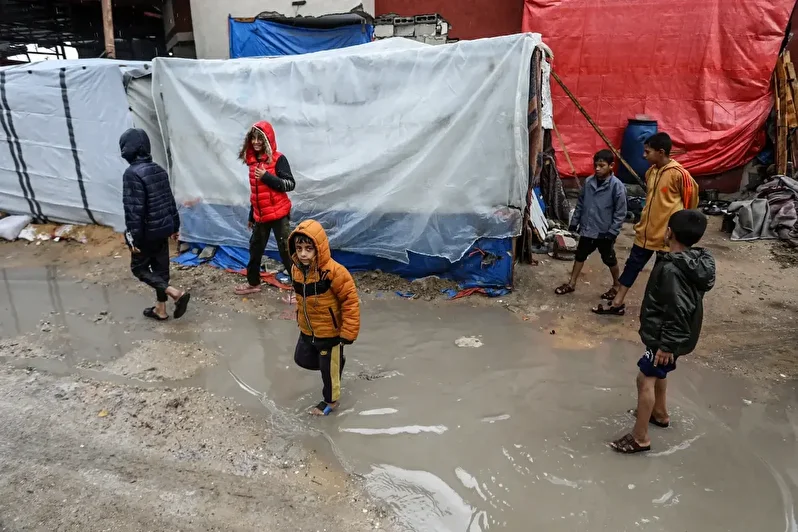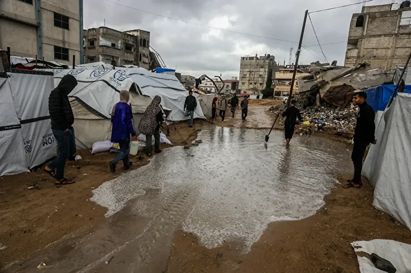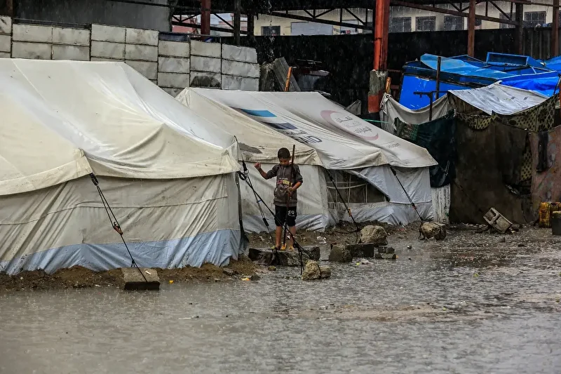 Gazze Şeridi’nin orta kesimindeki Deir el-Belah kentinde yerinden edilen sivillerin hayata tutunmaya çalıştığı El-Nakheel kampındaki çadırlar sel suyuyla doldu, çadırlardaki giysi ve battaniyeler kullanılamaz hale geldi.