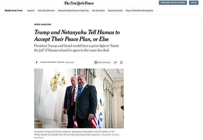 Amerikan New York Times gazetesi, “Trump ve Netanyahu Hamas’a Gazze planını kabul etmesini söyledi” manşetini kullandı.