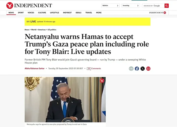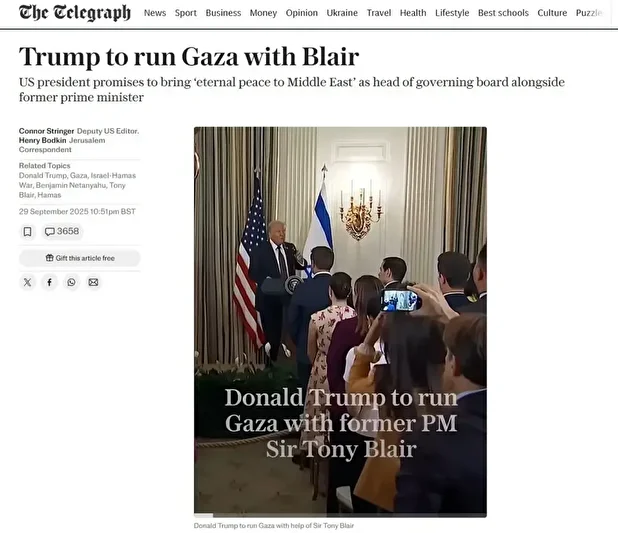 İngiliz The Telegraph gazetesi de “Trump Gazze’yi Blair ile birlikte yönetecek” manşetine yer verdi.