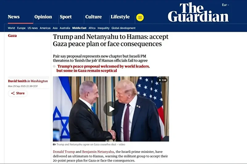 Guardian’ın manşetinde ise Trump ve Netanyahu’nun Hamas’a açık çağrı yaptığı belirtildi.