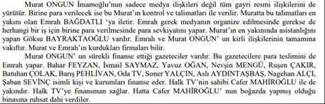 “Murat Ongun’un sürekli finanse ettiği gazeteciler vardır. Bu gazetecilere para teslimini de Emrah yapar. Bahar Feyzan, İsmail Saymaz, Yavuz Oğan, Nevşin Mengü, Ruşen Çakır, Batuhan Çolak, Barış Pehlivan, Oda TV, Soner Yalçın, Aslı Aydıntaşbaş, Nagehan Alçı, Şaban Sevinç isimli kişi ve kurumları finanse eder. Halk TV’nin sahibi Cafer Mahiroğlu ile de yakındır. Halk TV’ye finansman sağlar. Hatta Cafer Mahiroğlu’nun boğazda yapmış olduğu binasına ruhsat dahi verdiler.”