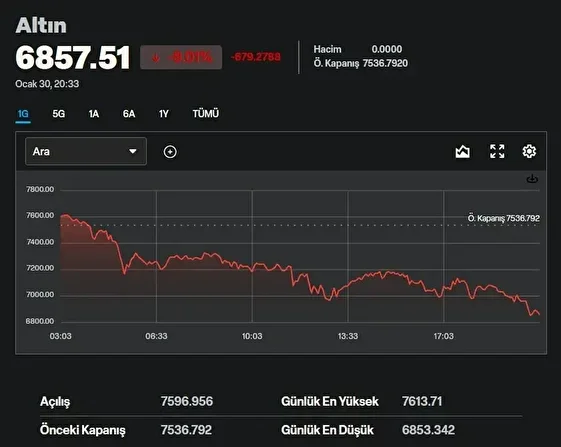 Jeopolitik gelişmeler ve ABD-İran gerilimine ilişkin endişelerle hafta içinde rekor seviyelere yükselen altın fiyatları, haftanın son gününde sert satış baskısıyla karşılaştı. Gram altın güne 7 bin 596 liradan başlarken, gün içinde 7 bin 613 lirayı gördü ancak gelen satışlarla 6 bin 853 liraya kadar geriledi. Akşam saatleri itibarıyla gram altın 6 bin 857 lira seviyesinde işlem gördü. Böylece gram altındaki günlük kayıp yüzde 9’un üzerine çıktı.