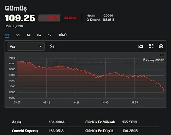 Değerli metallerdeki en sert düşüş gümüşte yaşandı. Dün 163 lira seviyesinden kapanan gram gümüş, bugün yüzde 33 kayıpla 109,25 liraya kadar geriledi. Önceki kapanışı 163.0513’ten gerçekleştiren gümüş son dönemlerin en sert düşüşlerinden birini yaşadı.