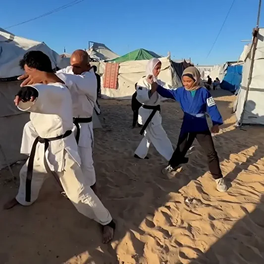 Gazze Şeridi’nin güneyindeki Han Yunus’a bağlı Mevasi bölgesinde, İsrail saldırıları nedeniyle evlerini terk etmek zorunda kalan çocuklar, karate sporuyla hayata tutunuyor. Gazzeli karate antrenörü Halil Şagaleh, savaşın yıkıcı etkileri ve zorlu yaşam koşullarına rağmen çadırlar arasında kurduğu açık hava eğitim alanıyla çocuklara moral aşılıyor.