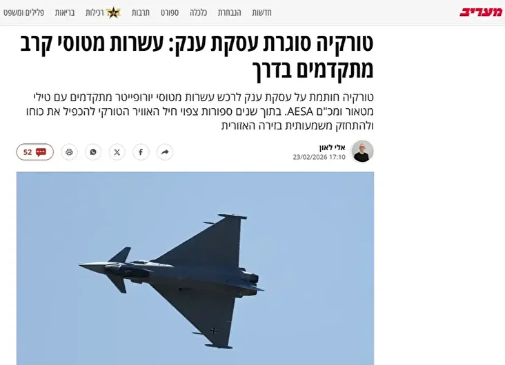 İsrail merkezli Maariv gazetesi, süreci okuyucularına “Ankara dev anlaşmayı tamamladı: Onlarca gelişmiş savaş uçağı yolda” başlığıyla duyurdu. İlgili analizde, Türkiye’nin bünyesine katacağı Eurofighter’ların AESA radar teknolojisi ve gelişmiş Meteor füzeleriyle donatıldığı, bu alımın son derece kritik ve büyük ölçekli bir hamle olduğu ifade edildi.