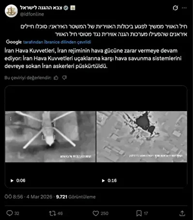 İsrail Savunma Kuvvetleri (IDF), Tahran’da düzenlediği hava saldırılarına ilişkin görüntü paylaştı. Görüntülerde Mi-17 helikopter ve F-4 savaş uçağının vurulduğu duyuruldu. Ancak videoda hedef alınan unsurların gerçek bir hava aracı değil, yere çizilmiş bir silüeti olduğu görüldü. Vurulduğu sanılan Mi-17 tipi helikopter ve F-4 savaş uçağı çizimlerinde herhangi bir patlama zinciri ya da yapısal hasar oluşmaması dikkat çekti.