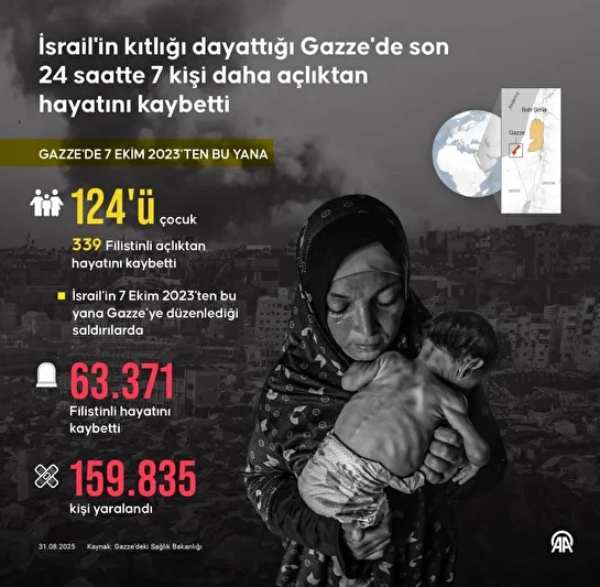 İsrail’in saldırıları ve ablukası nedeniyle kıtlık yaşanan Gazze Şeridi’nde son 24 saatte 7 kişi daha açlıktan yaşamını yitirdi. Gazze’deki Filistin Sağlık Bakanlığından yapılan yazılı açıklamada, açlıktan hayatını kaybedenlere ilişkin son bilgiler paylaşıldı. Açıklamada, son 24 saatte 7 Filistinlinin daha açlık ve yetersiz beslenme nedeniyle yaşamını yitirdiği belirtildi.