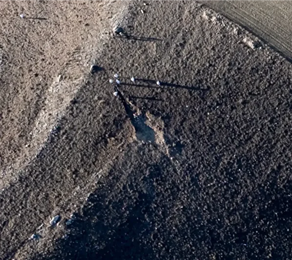Uçağın düştüğü bölgenin havadan çekilmiş fotoğraflarında, kazanın izi net şekilde görülüyor. Uçağın düşmeden evvel arazideki yüksek bir tepeye sürterek geçtiği anlaşılıyor. Topraktaki derin yarık, bunun delili. Parçalanma, çakılıp patlamadan önce tam da o anda başlamış. Çünkü derin izin bulunduğu alanın önündeki düzlük, uçağa ait parçalarla dolu.