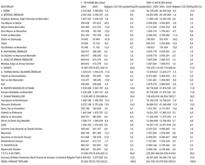 TİM verilerine göre, sektörel bazda 2024 ve 2025’in kasım ayları ve son 12 aylık ihracat verileri, değişim oranları ve toplam içindeki payları şöyle (bin dolar)