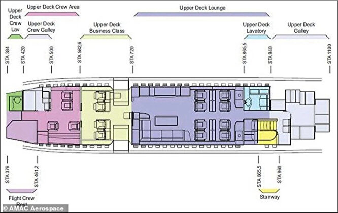 460’tan fazla yolcu kapasiteli günlük ticari 747’lerin aksine, bu jumbo jet uçağında yalnızca beş sıra standart business class koltuk bulunuyor.