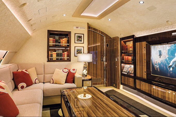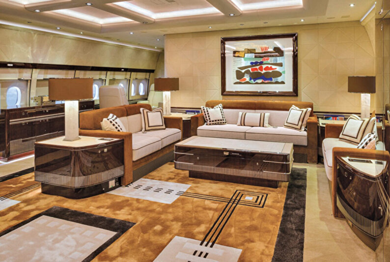 Uçaktaki hemen hemen her odada lüks halılar, deri koltuklar ve altın rengi mobilyalar bulunuyor.