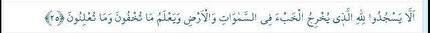 Neml Suresi 25. Ayet Türkçe meali : (Şeytan bunu) göklerde ve yerde gizli olanı açığa çıkaran, gizlediğinizi ve açıkladığınızı bilen Allah’a secde etmesinler, diye yapmış.