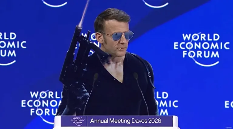 Güneş gözlüklü Macron, Tom Cruise’un “Top Gun” filminde canlandırdığı savaş pilotu Maverick’e benzetildi. Sosyal medya kullanıcıları Davos’ta konuşan Macron’a uçuş üniforması giydirdikleri görseller üretti.