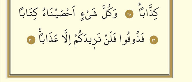 Ağırlıklı yoruma göre 29. âyette kayıt altına alındığı bildirilen “her şey” ile insanların sorumluluğu gerektiren inanç ve amelleri, iyilik ve kötülükleri; bunların kaydedildiği “kitap” ile de amel defteri veya levh-i mahfûz kastedilmiştir. Âyet, insanların dünyada yaptıklarından hiçbir şeyin Allah’a gizli kalmayacağını, yaptıkları her şeyden hesaba çekileceklerini gösterir. Hesapları görüldükten sonra yukarıda kendilerinden “azgınlar”, “hesaba çekileceklerini beklemeyenler” ve “Allah’ın âyetlerini yalanlayanlar” diye söz edilenlere, “Tadın artık! Bundan sonra size arttırarak vereceğimiz şey ancak azaptır” diye hitap edilir. Hz. Peygamber’in, Kur’an’da en ağır hitabın bu âyet olduğunu söylediği rivayet edilmiştir (Kurtubî, XIX, 182). Durumu açıklayan başka âyetlere göre onların derileri yandıkça yenilenecek (Nisâ 4/56), cehennemin ateşi hafifledikçe de ateş arttırılarak azapları devam edecektir (İsrâ 17/97).