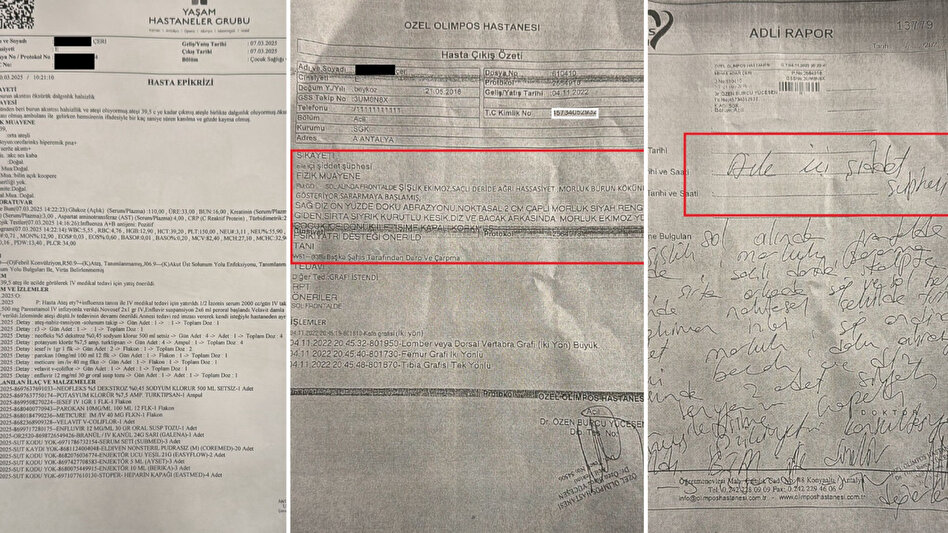 Küçük çocuğun hastaneden ateşli çıkarıldığı günün epikrizi. (solda) Çocuk B.’nin annesi Monika Drauciunaite tarafından darp edildiğine dair doktor raporları (ortada ve sağda)