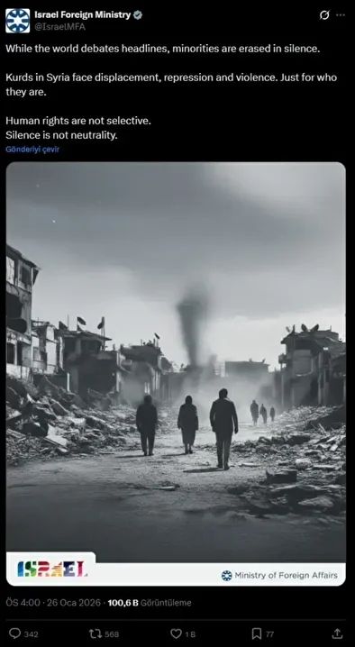 İsrail Dışişleri Bakanlığından yapılan açıklamada, ‘azınlık’ olarak lanse edilen PKK/YPG’nin ‘baskı ve şiddetle karşı karşıya kaldığı’ ifade edildi.