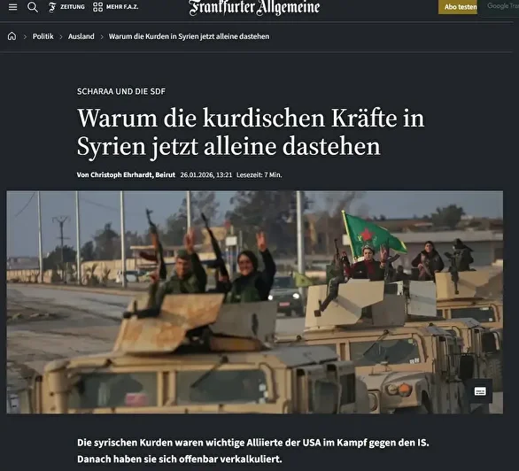 FAZ’da yer alan “Suriye’deki Kürt güçler neden şimdi tek başlarına kaldı?” başlıklı haber.