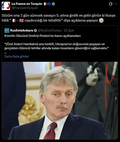 Fransa’nın Ankara Büyükelçiliği ise bu paylaşıma tepki göstererek, X sosyal medya hesabından “Sözüm ona 3 gün sürecek savaşın 5. yılına girdik ve gelin görün ki; Rusya hala Londra-Paris caydırıcılığı bir tehdittir’ diye açıklama yapıyor.” açıklamasında bulundu.