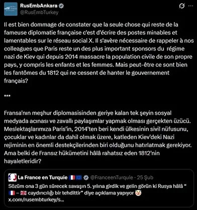 Rusya’nın Ankara Büyükelçiliği ile Fransa’nın Ankara Büyükelçiliği, sosyal medyada yaptıkları paylaşımlarla birbirlerini hedef aldı.