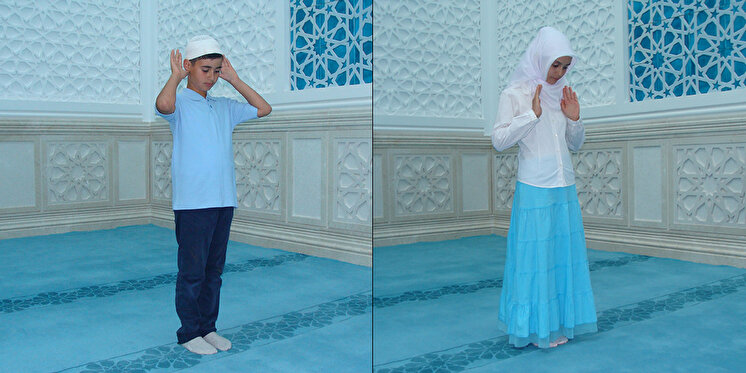 Erkekler, tekbir alırken; ellerin içi kıbleye karşı ve parmaklar normal açıklıkta bulunur. Başparmaklar, kulak yumuşağı hizasına gelecek şekilde eller yukarıya kaldırılır.Kadınlar, tekbir alırken; ellerinin içi kıbleye karşı, parmaklar normal açıklıkta ve parmak uçları omuz hizasına gelecek şekilde ellerini yukarıya kaldırır.