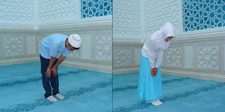 Rükû da iken ayakların üzerine bakılır. Erkekler, rükûda, parmakları açık olarak elleri ile dizlerini tutup sırtını dümdüz yaparlar. Dizlerini ve dirseklerini dik tutarlarKadınlar, rükûda, sırtlarını biraz meyilli tutarak erkeklerden daha az eğilirler. Ellerini (parmaklarını açmayarak) dizleri üzerine koyarlar ve dizlerini biraz bükük bulundururlar.