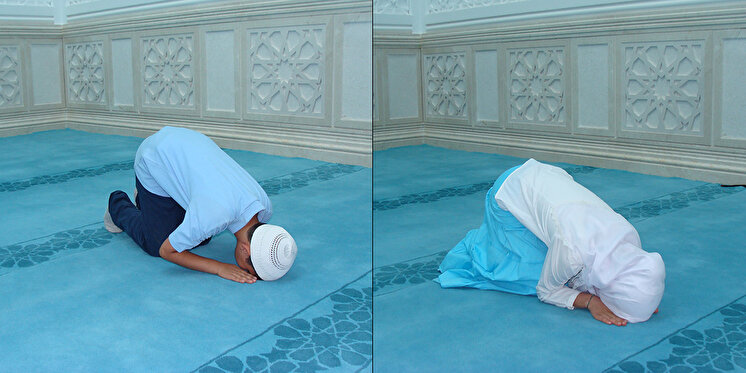 Erkekler, secdede dirseklerini yanlarından uzak, kollarını yerden kalkık bulundururlar. Ayaklar, parmaklar üzerinde dik tutulur ve parmak uçları kıbleye gelecek şekilde yere konur.Kadınlar, secdede kollarını yanlarına bitişik halde bulundururlar. Ayaklar, parmaklar üzerine dik tutulur ve parmak uçları kıbleye gelecek şekilde yere konur.