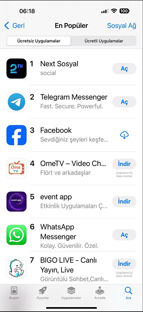 Kullanıcıların son dönemdeki ilgisini yansıtan sıralamaya göre, “NEXT Teknofest Sosyal”in ardından ikinci sırada Telegram, üçüncü sırada ise Facebook yer aldı. Listede dördüncü sırada OmeTV, beşinci sırada ise sosyal etkinlik odaklı “event app” uygulaması bulunuyor.