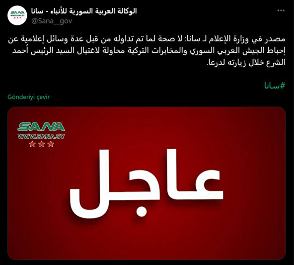 “Şara’ya Dera’da suikast girişimi Suriye Arap Ordusu ve MİT’in de desteğiyle engellendi şeklindeki haberler gerçeği yansıtmamaktadır”