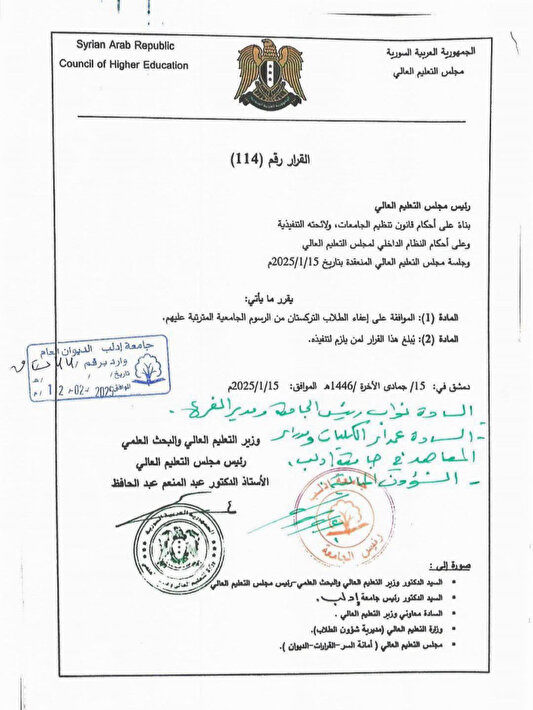 Baas rejiminin resmen sona erdiği 8 Aralık Devrimi’nin ardından ülkeyi istikrara kavuşturan yeni Suriye yönetimi, Milli Eğitim Bakanlıkları aracılığıyla Doğu Türkistanlı öğrencilere ücretsiz eğitim hakkı sundu. Karara göre; Suriye’de bulunan Türkistanlı öğrenciler, üniversite eğitimleri bitene kadar okullara tek kuruş dahi ödemeyecek.