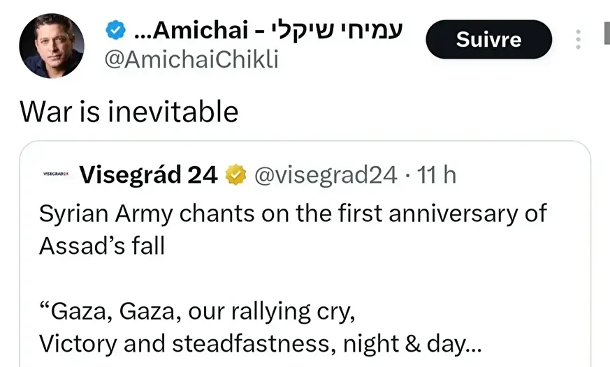 Başbakan Binyamin Netanyahu’nun partisi Likud mensubu Chikli, X sosyal medya hesabından, Suriye’de rejimin devrilmesinin ilk yılı kapsamında düzenlenen askeri geçit töreninde Suriye askerlerinin Gazze’ye destek sloganları attığı videoyu paylaştı.