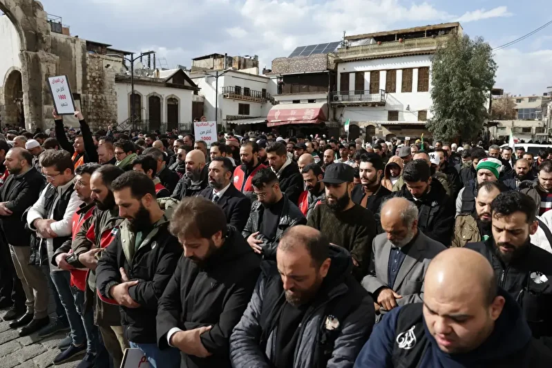 Emevi Camii’nin girişi toplanan katılımcılar, Suriye’deki çatışmalarda hayatını kaybedenler için dua etti.