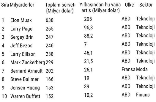 Dünyanın en zengin iş insanı 638 milyar dolarla Tesla’nın sahibi Elon Musk olurken, dünyanın en zengin 10 iş insanının serveti 2,5 trilyon doları aştı. Yılın başından bu yana dünyanın en zengin 10 kişisinin servetleri 558,9 milyar dolar arttı. Tesla’nın sahibi Elon Musk 638 milyar dolarlık servetiyle zirvedeki yerini korurken, onu 265 milyar dolarla Google’ın kurucu ortaklarından Larry Page, 247 milyar dolarla Google’ın diğer kurucu ortağı Sergey Brin takip etti.