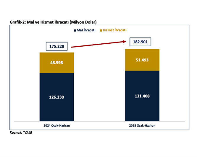 2025 Haziran Ayı İtibarıyla Yıllıklandırılmış Olarak Hizmet İhracatı %7,1 Artışla 117,7 Milyar Dolara Yükselmiştir. Seyahat Gelirlerimiz Yıllıklandırılmış Bazda 58,1 Milyar Dolar, Taşımacılık Gelirlerimiz 40,2 Milyar Dolardır. Sonuçta Toplam Mal ve Hizmet İhracatı 2025 Haziran Ayı İtibarıyla Yıllıklandırılmış Olarak %4,3 Artışla 384,7 Milyar Dolara Yükselmiştir.