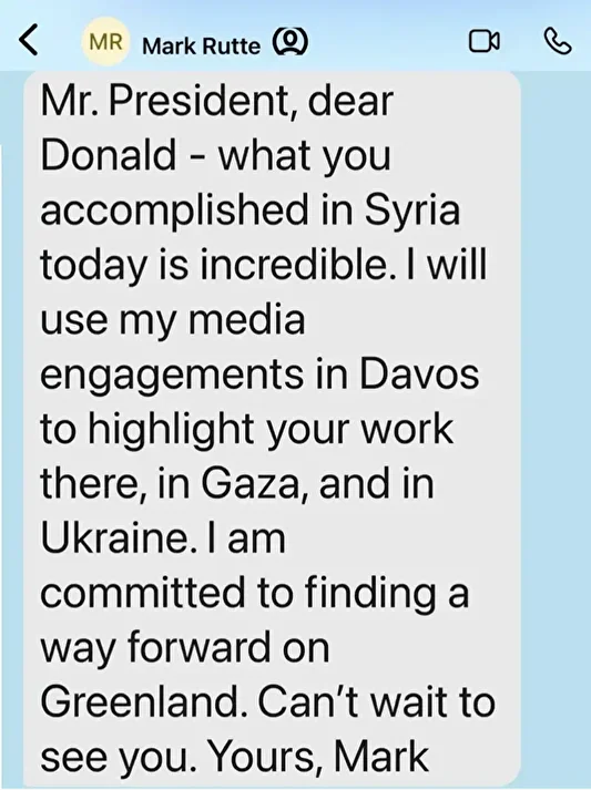 Rutte’nin mesajında “Sevgili Donald, Suriye’de neler başardığın inanılmaz. Davos’taki medya bağlantılarımı kullanarak orada, Gazze’de ve Ukrayna’da yaptıklarını öne çıkaracağım. Grönland için bir yol bulmaya kararlıyım. Seni görmek için sabırsızlanıyorum” dediği görüldü.