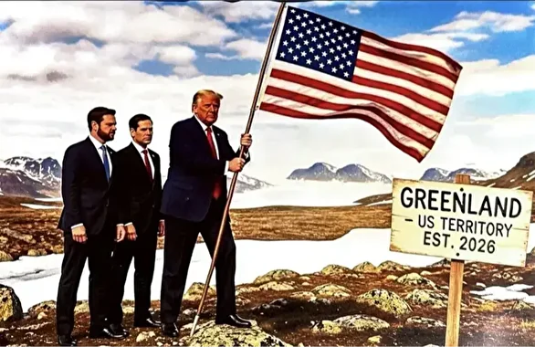 Trump, kendisinin ABD Bayrağı taşıdığı, yardımcısı JD Vance ve Dışişleri Bakanı Marco Rubio’nun önünde “Grönland. ABD toprağı” tabelası yanında yürüdüğü bir görsel paylaştı.