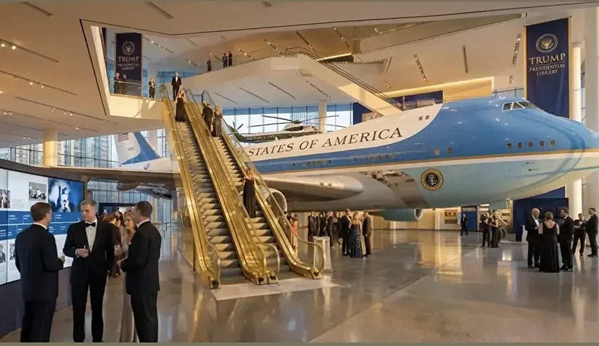 Kütüphanenin zemin katı, ABD başkanlık uçağı Air Force One’ın sergilendiği bir havacılık galerisi olarak tasarlandı. Ziyaretçiler, uçağın etrafını çevreleyen yürüyen merdivenlerle üst katlara çıkarken, salonun merkezinde Donald J. Trump’ın yumruğunu havaya kaldırmış devasa bir altın heykeli yükseliyor.