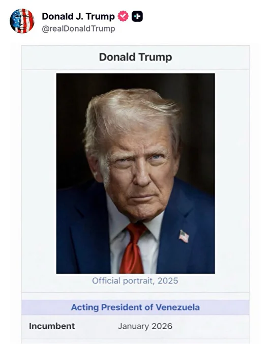 11 Aralık Pazar günü Truth Social’da yayınlanan gönderide, Trump’ın resmî portresi “Venezuela’nın Geçici Başkanı, Görev Süresi Ocak 2026” ibaresiyle birlikte yer alıyor. Ayrıca, 20 Ocak 2025’te göreve başlayan 45. ve 47. ABD Başkanı olarak da tanımlandı.
