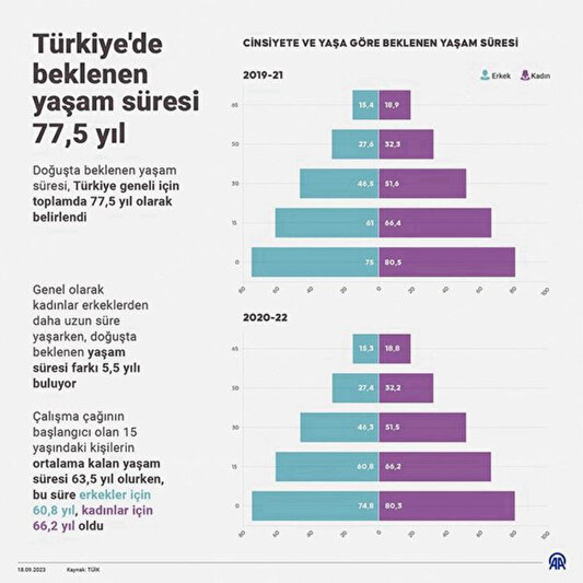 Türkiye’de 65 yaşındaki bir kişinin kalan yaşam süresi ortalama 18 yıl olarak kayıtlara geçerken, bu süre erkeklerde 16,3 yılı, kadınlarda 19,6 yılı buluyor. 65 yaşındaki kadınların erkeklerden ortalama 3,3 yıl daha uzun yaşaması bekleniyor.